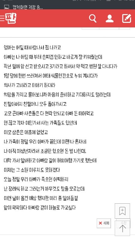 오늘 이 글쓴 애 맞아 우리 아빠 내가 저 글 올리고 얼마 안되서 결국 돌아가셨어.
