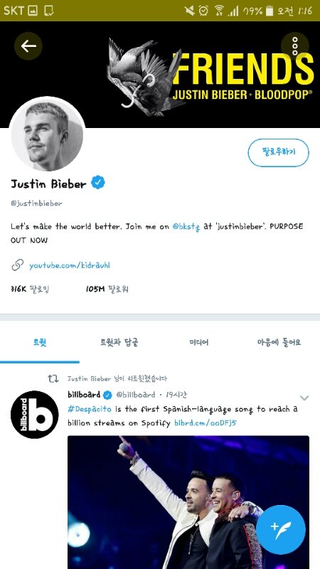 저스틴 비버가 뷔 팬 계정 팔로우하고 있더라 싱기해서 ㅎ