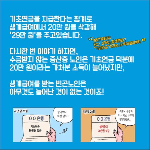 3. 수급노인의 통장에는 1월에 기초연금이 들어오고 2월에 생계급여가 그만큼 삭감되니 결과적으로 플러스 마이너스 제로. 결과적으로 정부는 가난한 노인의 기초연금을 줬다 뺏는 복지행정을 하고 있다.