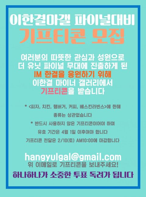 파이널 투표를 위해 이한결마갤에서 기프티콘을 모으고 있어. 정말 한표라도 더 보태면 데뷔도 꿈이 아닐거라 생각해..한결이 사랑하는 팬들아 정말 정말 도움이 필요하다. 상위권 남돌들도 이벤트 정말 화려하게 준비중인데 조금이라도 비벼볼 수 있게 하나 하나 작은 정성이라도 줄 수 있는 팬들 찾아..더 자세한 건 이한결마갤에서 물어봐도 되고 커피깊콘이라도 기부해주면 고맙겠어!! 한결이 데뷔시키자!!!꼭!!!