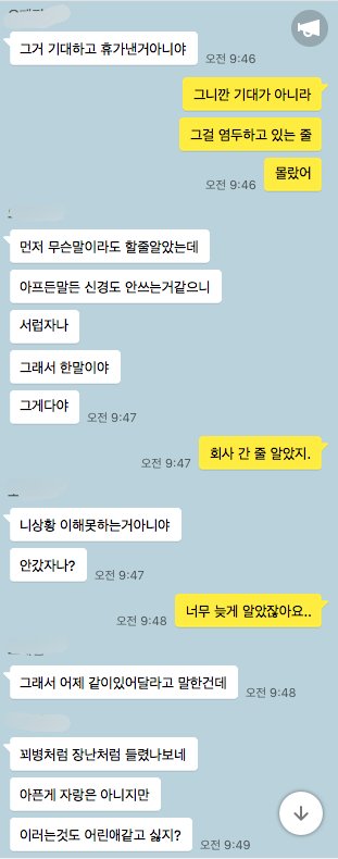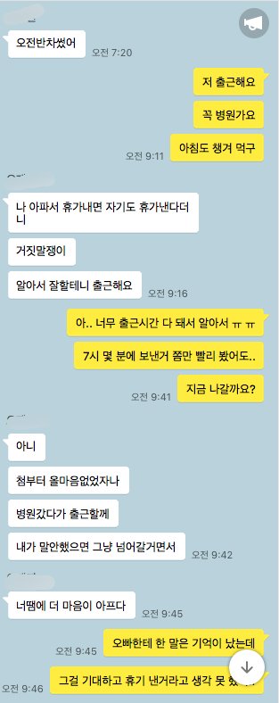 제가 그 얘길 듣고, "오빠가 휴가쓰면 나도 휴가쓸게!" 라고 대화를 나눴고, 저녁이 되니 아픈데 집에 가지 말고 본인 간호 좀 해주면 안되겠냐고 묻길래 "잠은 집에 가서 자야지" 하면서 집으로 돌아왔습니다.