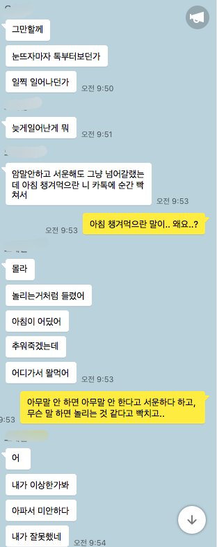 제가 톡을 늦게 봐서, 이미 회사 출근을 해버렸고 그래서 위와 같이 대화가 이어졌습니다.