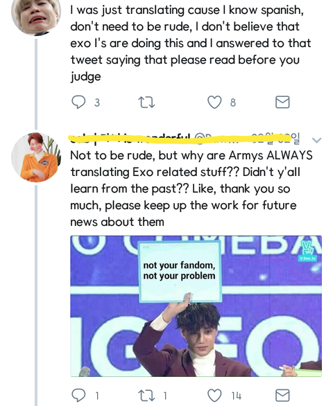 :왜 아12미들은 항상 엑소엘 트윗을 번역하는거야?;(=지들 일도 아니면서 관심 조지게 많구나;;)