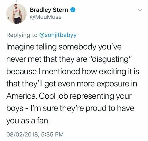 해석이 잘못됐는데, 저 기자가 "올림픽에 엑소가 공연한다는 사실을 듣고 좀 놀랐다. 이걸로 더 많이 서구에 노출이 될수있겠다"고 적었는데 엑소 팬들이 분노해서 저 기자한테 방탄 편만 든다고 "disgusting"하다고 멘션공격을 하기 시작한거야. 기자와 팬들 사이에 계속 설전이 벌어진거구. 엑소 팬들 진짜 디제이랑 기자 건들여봤자 그거 다 엑소한테 좋은 이미지가 아닌데 왜 계속 저러는지 모르겠다. 자제 좀 시켜라.