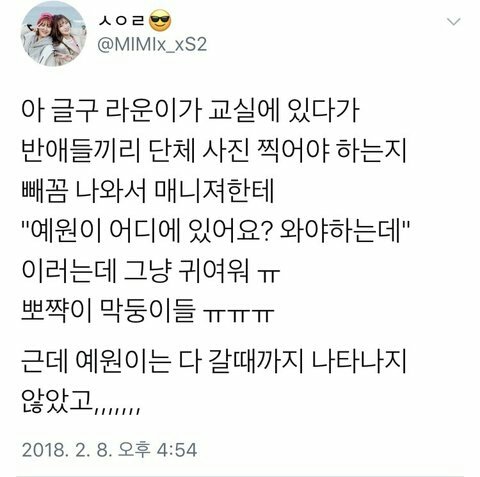 둘이 같은 반인데 반에서 단체사진을 찍는다고 해서 찍으려고 하니 아린이가 사라져서 라운이가 '예원이 어딨어요..?' 라고 급하게 찾았지만 아린이는 결국 오지 못 했다고..