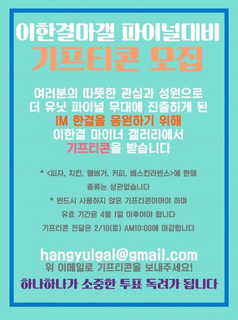 내일 더유닛 문투 확보를 위해 이벤트 상품을 이한결 마갤에서 모으고 있어!! 상위 정병 거의 생방진출한 모든 남돌들 갤에서 어마어마한 량의 치킨과 커피들을 내세워서 홍보중인데..이한결마갤은 인원이 극소수라 모아도 너무 부족해..타 남돌마갤도 일반 팬분들 협조 얻어서 상품 마련했다는데..제발 도와줄 수 없을까..한결이 제발 데뷔시키자 ㅠㅠ
