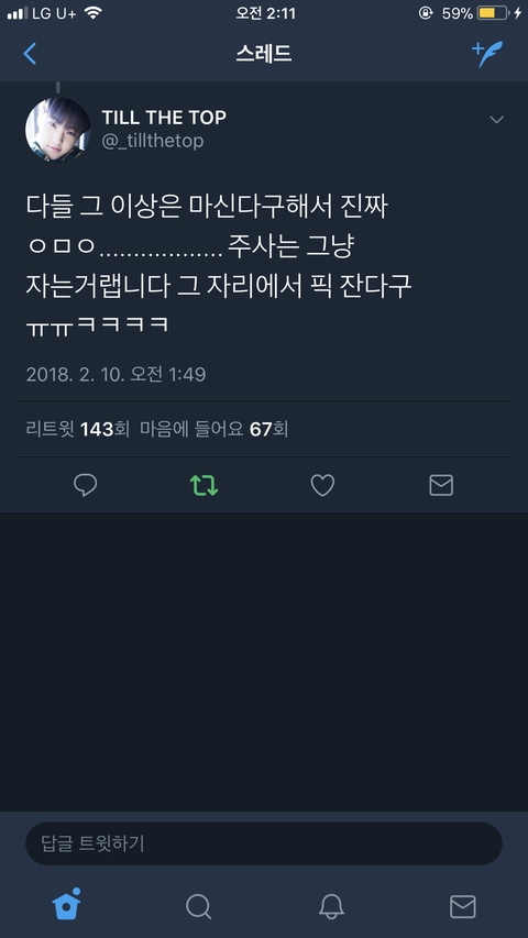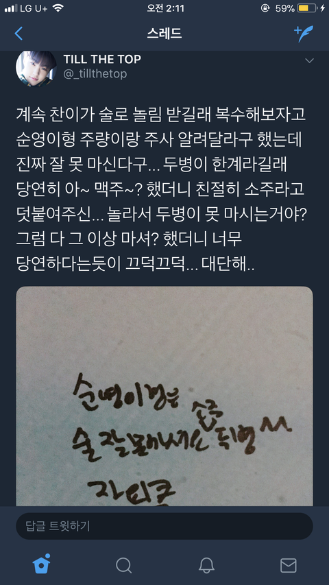 와ㅠㅠㅠㅠㅠㅠ 나 왜 소주 두병에서 멋있어보이냐... 난 소주 두병마시면 아예 골로가는데...주사는 왜 또 귀엽고 난리ㅠㅠㅠㅠㅠ 상상가ㅠㅠㅠㅠㅠㅠㅠㅠㅠ아 미치겠다 그와중에 나머지 멤버들은 두병 이상이라는거에 또 발림...