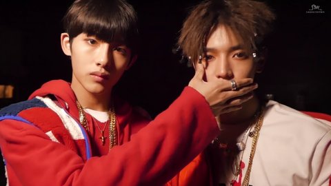 태용의 입을 막는듯한 모션. 태용을 도와주는건지, 아니면 방해를 하는건지