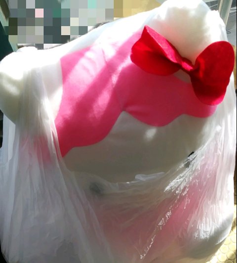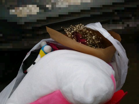 키티인형 큰 거 하나와 작은 거 하나, 마른 꽃다발, 흰
