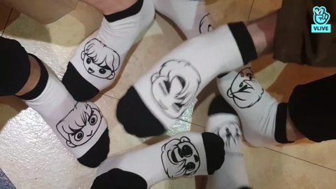 그다음 4주년팬미팅 하기전 브이앱에서 서로의 굿즈 양말을 신고 스포를 하는뎅!! 진영이가 처음에 위에서 슨이가했던것처럼 발을 휘적휘적 거림 그다음 발로 모양을 만든담에 흩어졌다 모이는 동작을 함!!