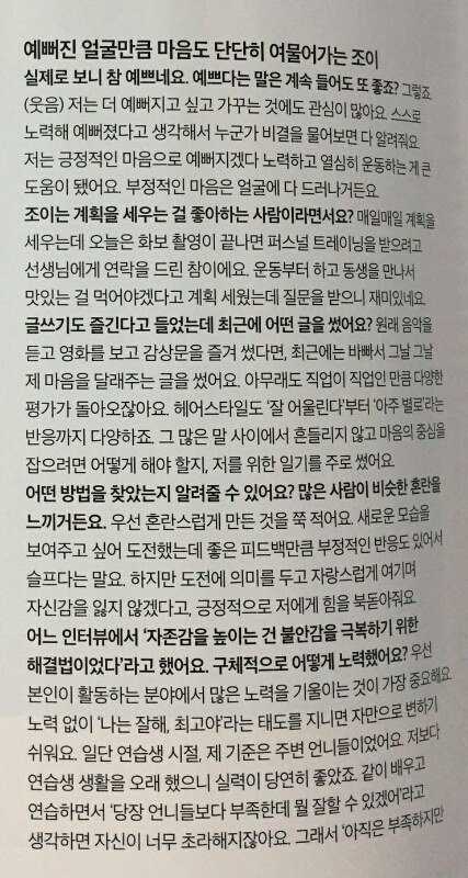 인터뷰 내용인데 진짜 생각 깊게 말하는거 같아. 자신에 대한 안좋은 얘기 이런것들도 다 하나하나 읽어보면서 고칠려고 노력하고 아 내가 이런점이 잘못되었구나 라는걸 느끼고 고쳐서 노력하는거 같음...조이가 집안에서 장녀인데 첫째인만큼 책임감도 많아야해서 원래 웃음이 잘 없는 편이었는데 이제 연습생 생활 걸치고 데뷔할때 예명을 짓는데 항상 즐기고 밝게 웃자는 뜻으로 조이라고 지었다고 함. 항상 자신이 어느 부분에서 부족하고 어느 면에서 더 노력해야하는지 알고 그만큼 피드백도 많이 하는 성격인듯..작년에 첫 드라마 촬영하면서 비판도 많이 받았을텐데 자신 나름대로 또 엄청난 노력을 했을듯. 이번에 위대한 유혹자 드라마 여주 맡았는데 더 연기 부분에서 더 성장한 조이 모습 볼 수 있을거 같다. 촬영지 보니까 한방병원에서도 촬영했고 조이피셜로 자신이 이번에 맡은 캐릭터가 약간 지적있고 쉽게 넘어가지 않는 (?) 그런 도도한 캐릭터라는데 기대되네.