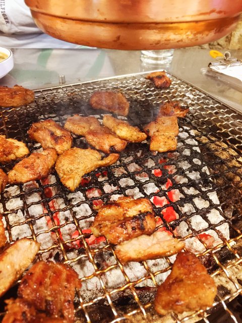 고기를 올려놓으니 고기가 오븐에서 익는거마냥 천천히 익길래 불보니 위에 숱은 하얗게 변해 불기를 잃음 그래서 불좀 더 넣어달라고 하니까 불 넣어주는 사람이와서 "이거 불이 죽은게 아니라 원래 그런거라고 새 숱을 넣어주는데 새숱은 빨감.