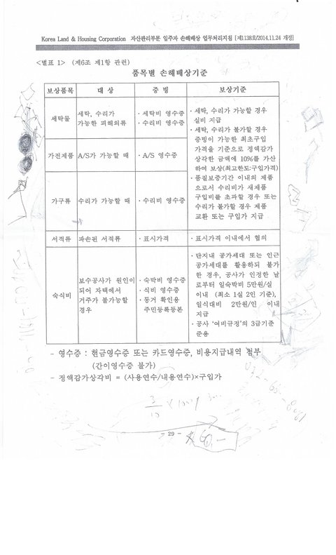 ※사실 인터넷으로 검색하여 손해사정사와 몇 차례 상담을 했었습니다. 손해사정사를 통하면 저희가 보상받을 수 있는 액수도 더욱 늘어나더군요. 하지만 LH직원들이 최대한 협조해줄테니 원만히 합의해달라 라고 통 사정하기에 참고 있었습니다.(입주자 피해의 처리과정에서 발생되는 운반비용,시험,검사비용 등의 경비는 공사가 부담하기로 되어있습니다