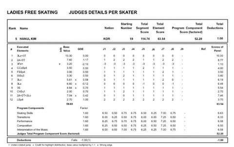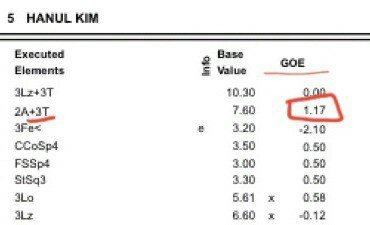 이 선수의 발을 보면 3회전이 다 안되고 땅에 내려왔지? 하지만 프로토콜(시험지?경기 결과 같은거야!)을 보면 심판들은 이 점프에 감점은 무슨 오히려 가산점(goe)를 줬어.