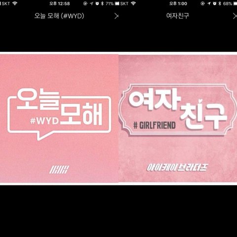 ⬆️그리고 왼쪽은 아이콘 '오늘모해'라는 곡 커버이고 오른쪽은 아이케이 브라더즈 '여자친구'라는 곡 커버인데 #위치도 같고 핑크 바탕에, 흰색 폰트랑 테두리, 두글자씩 계단 배열, 해시태그표시랑 위치동일, 밑에 그룹명 흰색폰트까지 같음