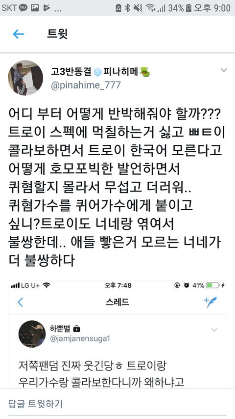 제일 심한애.. 밑에 얘는 심지어 애들이 하지도 않은 퀴어혐오를 너무나 당연한 듯이 덮어 씌우고 매도하고 있어 다른 애들은 몰라도 얜 진짜 꼭 부탁할게