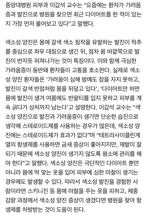 원래는 외국에서 몇 번 일어난 희귀한 케이스였는데 최근 몇 년 사이에 발병자가 엄청 늘었대 보니까 나랑 엄청 비슷한 거야 ㅠㅜㅜㅜ 막 간지럽고 상체 위주로 난다고 하더라