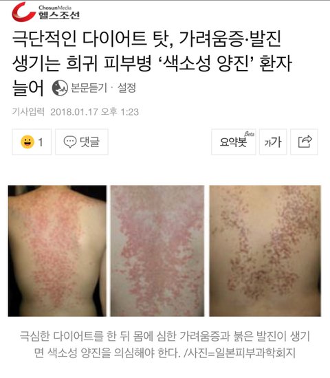 그래서 약 처방 받고 바르는데 자꾸 나을 기미가 안 보이는 거야 그래서 오늘 미친 듯이 검색하다가 ‘색소성 양진’ 이라는 게 있더라구 그래서 함 보니까 극심한 다이어트(특히 탄수화물 너무 안 먹으면)때문에 나타나는 희귀병이래
