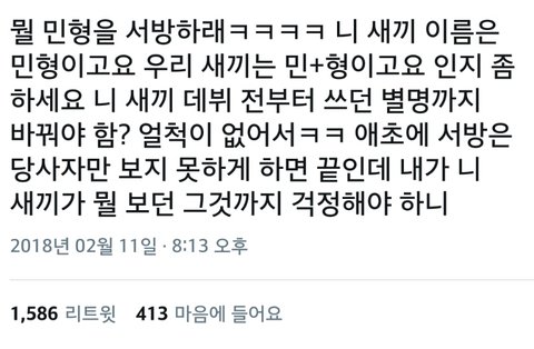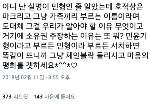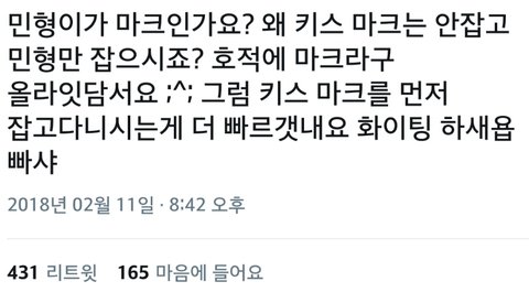 더 가관인건 방탄팬들 팩트폭력에 논리적으로 반박 못하니까 민형 구분할거면 그쪽은 군대가는 한남 민형이라고 풀네임 붙이라면서 유치하게 군대얘기밖에 못함