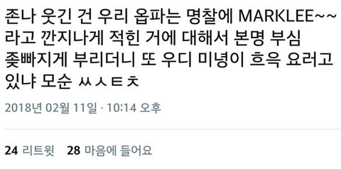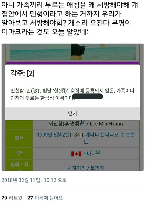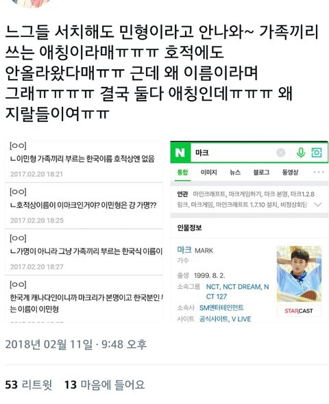 마크팬들 영어이름이라고 부심부리더니 무슨 호적에도 없는 친척들끼리나 쓰는 민형이란 이름 가져와서 법적권리있는것처럼 딴팬덤에 깡패짓하고 유세부리다가 지금 개처맞고있음