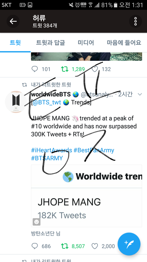 콘서트끝나는시간맞춰서 실트총공...난 호석이가 정화실트올렸다는거에서 거의오열했어