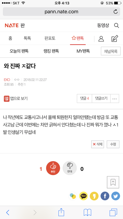 난 뒷자석에 타 있었고 차도 도색만 하면 될정도로 그냥 차만 긁힌건데 보험회사 사람이 그 사람들은 직진이고 우리는 우회전이라서 우리가 가해자라고 하더라 그러면서 그 쪽 사람들이 입원한다고 하면은 우리도 가서 하라고 하더라? 근데 설마 입원하겠어 했거든 진짜 너무 멀쩡했어 우리 쪽이든 그 쪽 사람들이든 근데 그 사람들 입원한다고 했다더라ㅋㅋㅋㅋㅋ