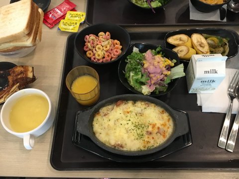 기숙사에 살게되면 아침도 먹을 수 있는데 아침은 조식뷔폐처럼 나와서 핫케익이랑 식빵은 스스로 구워먹을수 있구요 씨리얼도 세종류? 주스는 2종류정도 나와요!!