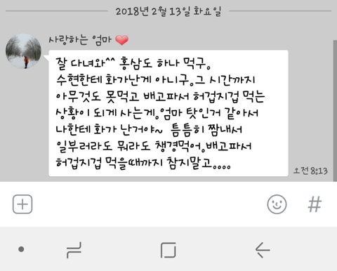 제가 서비스직 일하는데 밥시간은 불규칙적이고 저녁은 못먹어서 집와서 허겁지겁 먹다가 엄마가 왜이렇게 많이 먹냐 저녁엔 먹으면 안좋은데 라고 말씀하시면서 전 배고파서 먹는건데 서러워서 약간 엄마와 말안하고 꿍해 있었는데 아침에 이렇게 톡이오네요... 엄마 탓 아니에요 부족한 딸이라서 미안해요