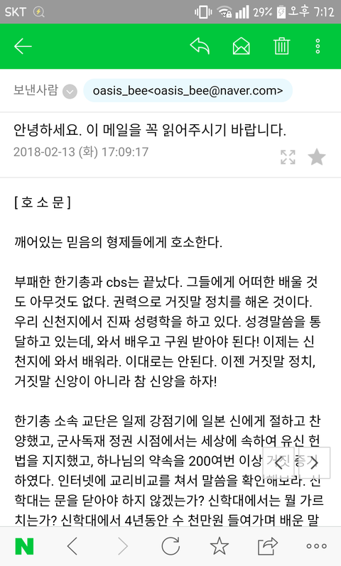 부패한 한기총과 cbs는 끝났다. 그들에게 어떠한 배울 것도 아무것도 없다. 권력으로 거짓말 정치를 해온 것이다. 우리 신천지에서 진짜 성령학을 하고 있다. 성경말씀을 통달하고 있는데, 와서 배우고 구원 받아야 된다! 이제는 신천지에 와서 배워라. 이대로는 안된다. 이젠 거짓말 정치, 거짓말 신앙이 아니라 참 신앙을 하자!