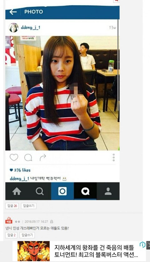 왜 자기가 욕한다고 남들도 다 한다 생각함? 난 현실에서 손가락 욕 한적 한번도 없어 그리고 저런거 인스타에 올리는게 이상함