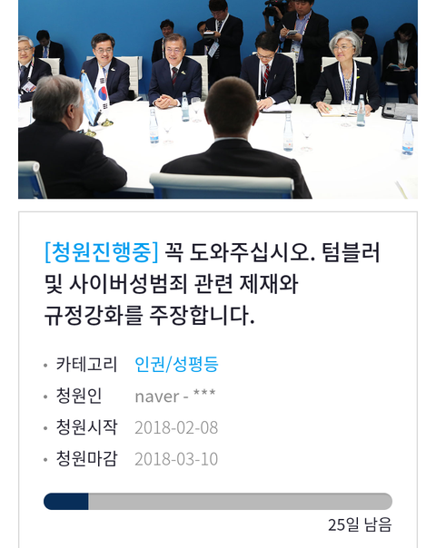위 청원서는 텀블러 및 사이버성범죄 관련 제재와 규정강화를 주장하고, 20만명을 목표로 하고있어.