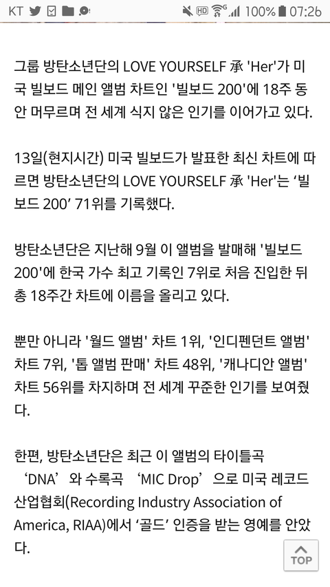 18주간 빌볻200 안착, 한국가수 최다 롱런 기사