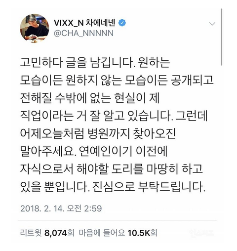 타팬이 자기 고모네 병원에 빅스 엔 왔다고 해서 갔더니 진짜 있었다, 정수기에서 물 먹는데 우연히 마주쳐서 인사해줬다 이런 식으로 멘션을 올렸음- 팬들이 글 내리라고 함- 엔이 그 타팬한테 글 내리라고 디엠 보냄- 디엠 캡쳐해서 자랑함- 사생팬포함 팬들이 병원에 몰려서 사진 찍어달라고 함- 빡쳐서 트윗 올림