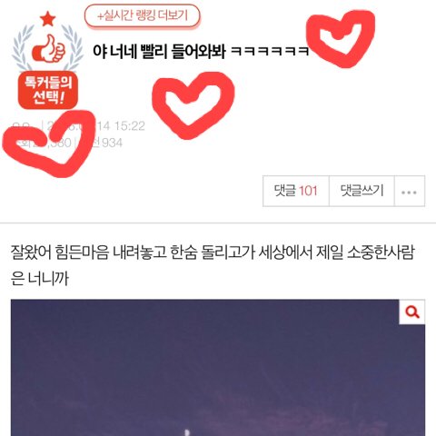 +) 재수정해 내글이 어그로다, 답없다, 톡선가고싶어해서 안달난 글이다 하는데 너네들 마음대로 생각해도 좋아. 난 적어도 내 글에 추천눌러준 1000명은 어느정도 힐링하고 갔다고 생각해서 상관없어. 그리고 지금 이걸 일고있는 힘든 판녀들아 너무 걱정하지마. 니가 지금 이렇게 당하는거 다음에 두배는 더 행복한 일들로 돌아올거야. 니가 흘린 눈물이 헛되지 않을거야. 오글거린다고 해도 좋아. 그냥 이게 내가 하고싶은 말이었어. 다들 좋은하루보내❤️ 톡선 너무 고맙고❤️