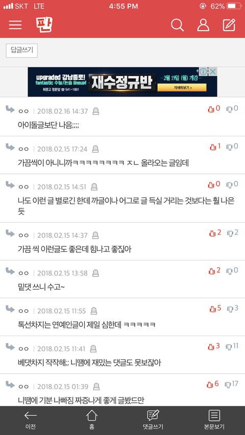 ++++ 제목바꿨어 이렇게 욕먹을지 몰랐다 몇몇 판녀들 눈살 찌푸리게 했다면 미안하고 댓글로 싸우지 않았으면 해 원인은 나니까 그리고 날 욕하는 댓글들도 틀린말은 아니더라고 그렇다고 다 맞는말은 아니구.. 아무튼 오늘 남은 하루도 잘보내 안녕