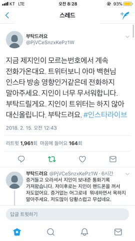 여기에 ㅇㅅㅇ들 많길래 ㅌㅇㅌ 에서 가져온간데 아무죄없는 일반인이 힘들어한다잔아 니내가 계속 전화걸면 변백현이 사생한태 전화걸라고 깐게되는거아님 나대신 얘좀 밟아주라는것도아니고