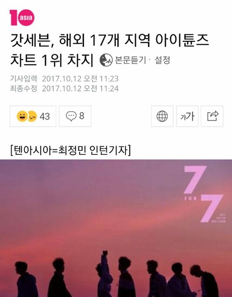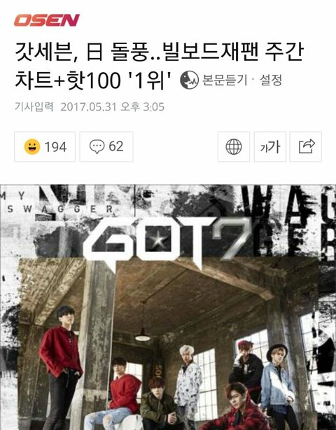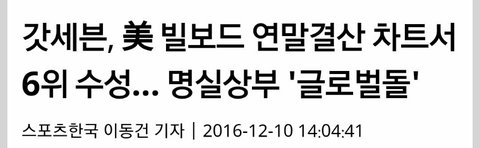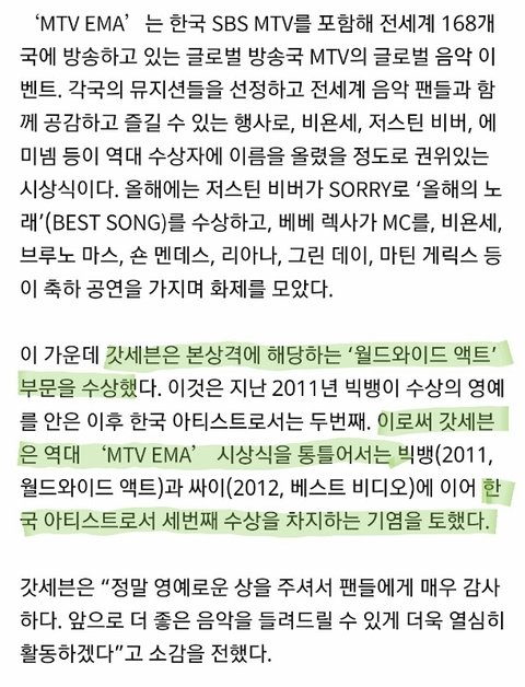 갓세븐 세계 3대 시상식 EMA에서 아리아나 그란데, 트로이 시반등 유명 팝가수와 함께 공동수상. 2012년 싸이수상 이후로 단 한번도 우리나라는 후보에도 오르지 못함. (투표없는 100%심사위원 평가로만 이루어지는 수상이고 우리나라에서는 빅뱅, 싸이만 수상.)