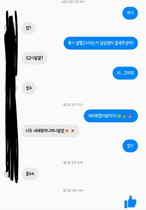 근데 그때가새벽2시쯤이라 답이온게 ㄷㄷ이밖에없었어요 사진보시면 아시겠지만 별내용없었거든요 그리고 1월1일 답이왓는데 늦게봤거든요 씹기뭐해서 그 페메 따봉이모티콘을 하나보냈죠 5일날 그랬는데 ㄷㄷ이가 심심하냐고하더군요 그래서 아니라고하고 별뜻없었다하고 그냥 말았어요
