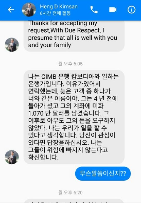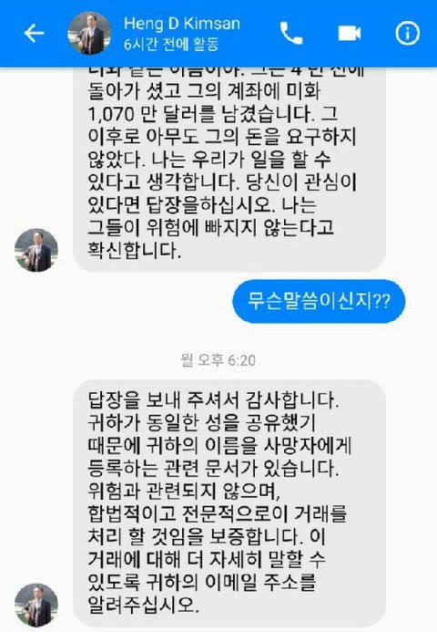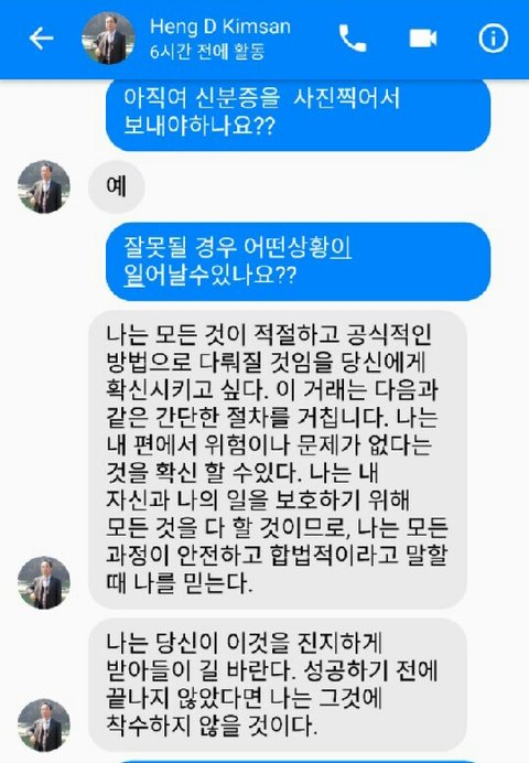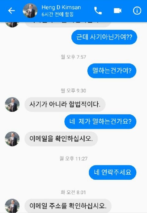 페이스북 계정으로 스샷과 같은 내용으로 일창, 문의가 왔는데 이게 당췌 사기인지 아닌지 모르겠습니다