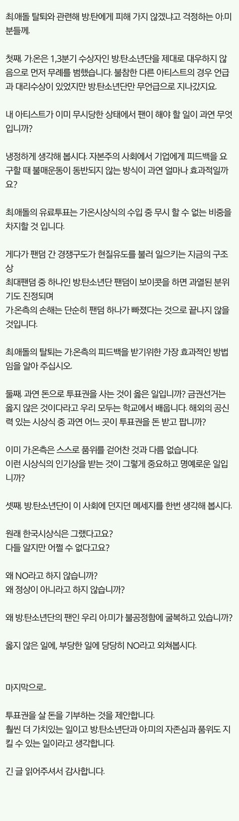 가수와 그들의 음악을 아끼고 사랑하는 마음을 돈으로 증명하는 거...다들 한편으로는 아니다 싶으면서도 우리 가수를 위해 정말 열심히 했을 거야. 그런데 생각해보면...분야와 지역을 막론하고 정말 권위와 공정성을 인정받는 어느 시상식도 이런 선정과정은 없어. 누군가는 나서서 해야 했을 일이었다고 생각해. 우리의 지금 결정이 큰 흐름이 될거야.