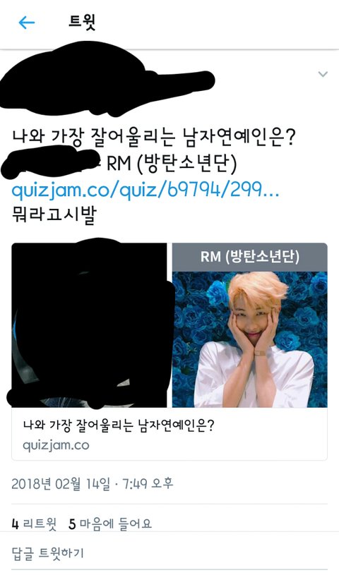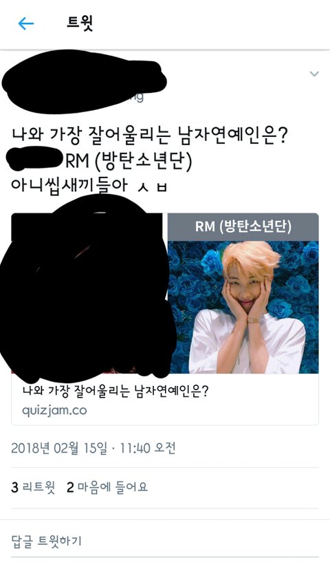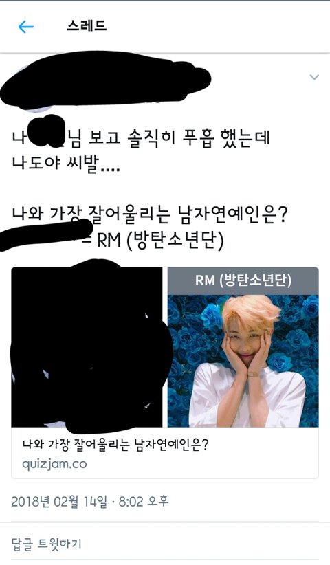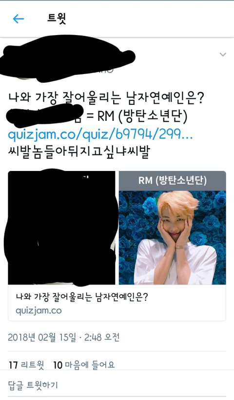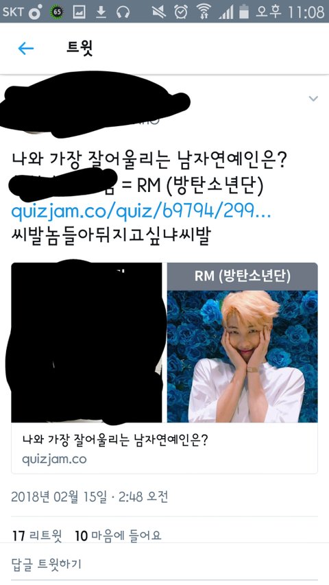 실트 남자연예인 떠서 뭔가하고 들어갔는데 방탄 RM 나왔다고 신발신발대며 욕하더라 ㅋㅋㅋㅋ