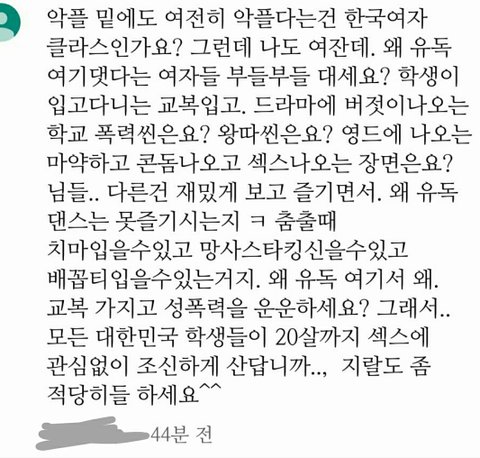 일반 노출 의상과 학생들이 입는 교복은 다른 건 알고 있지? 그리고 웨이브야 분들 에 대해서도 다른 내용(몸 얼굴 평가 안 돼) 으로도 흘러가지 않았음 좋겠어 참고로 나는 메갈 여시 쭉빵 워마드 안 해~