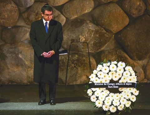 일본 외무성 장관이 홀로코스트 기념관에 참배하며 희생자들을 애도하고 있다...