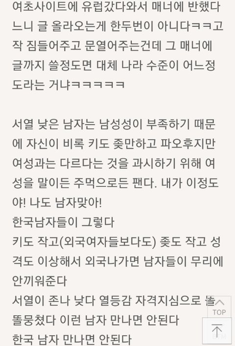 한국남자 진짜싫음 미국나와서 사는데 여기남자들이랑 비교하면 한국남자들 찌질,열등감덩어리임;