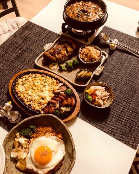 메뉴는 치즈 돈까스와 육개장 , 치즈콘옥수수,소세지구이,김치볶음밥,피넛샐러드 입니당~!