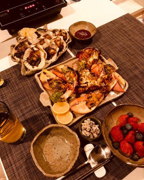 가리비 치즈구이와 홍합탕 ,랍스타찜,곱창볶음 ,육포,과일