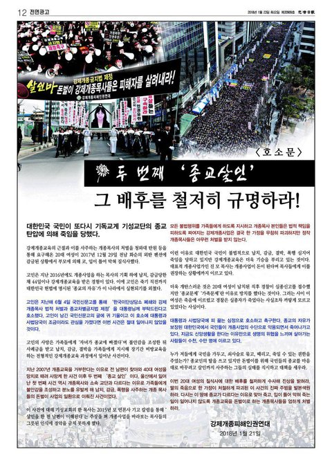 이제는 한 장의 유서로 남게 된 청년의 애절하고 간절한 호소문 꼭 읽어 보시고,이 땅에 강제개종교육으로 인한 피해가 더이상 생기지 않도록함께 마음 모아 주시기 바랍니다.