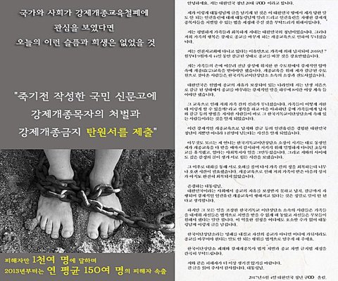 이제는 한 장의 유서로 남게 된 청년의 애절하고 간절한 호소문 꼭 읽어 보시고,이 땅에 강제개종교육으로 인한 피해가 더이상 생기지 않도록함께 마음 모아 주시기 바랍니다.
