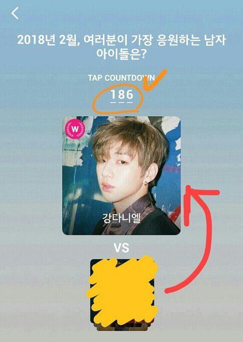 240여명 남자아이돌 사진이 나오는데 강다니엘 나오면 저렇게 위로 끌어 올리고 아래 생기는 사진들은 탭 카운트 다운 숫자(주황색 표시해둔 부분)가 0이 될 때까지 아래로 끌어 내리면돼