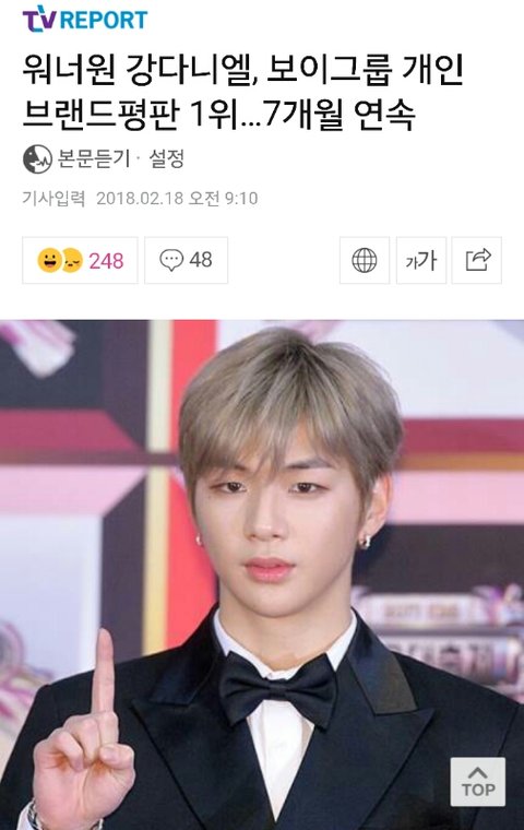 기사)워너원 강다니엘, 보이그룹 개인 브랜드평판 1위…7개월 연속